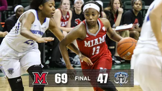 DAYTON, Ohio - The Miami University women's basketball team used a balanced effort in taking down Fort Wayne, 69-47, on Monday evening at the Wright State Invitational. The victory marked the team's second in a row and improved their record to 4-6, while the Mastodons fell to 2-9.