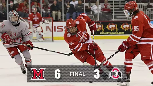 COLUMBUS, Ohio - Columbus natives Kiefer Sherwood and Carson Meyer combined for three goals and an assist in their return to their home towns to help the Miami hockey team post an impressive 6-3 comeback win at No. 9/10 Ohio State.