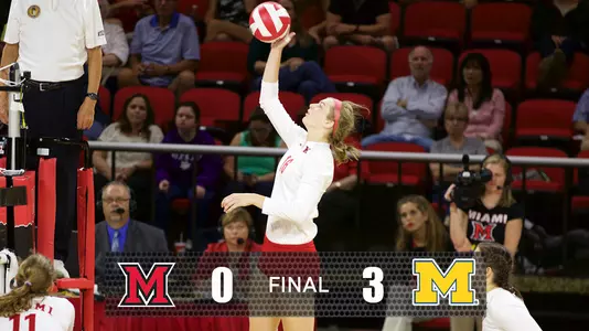 ANN ARBOR, Mich. -- The Miami University volleyball team dropped a 0-3 (16-25, 20-25, 18-25) decision to the host Michigan Wolverines in their morning match at the Michigan Invitational on Saturday. The RedHawks fall to 0-2 on the season, while the Wolverines improve to 2-0.