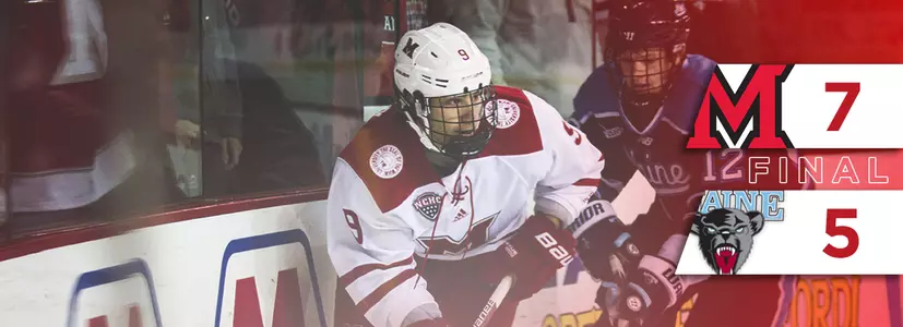 The Black Bears would not go quietly. A power play goal by Eduards Tralmaks made it 7-4 and Rob Michel cut the gap to 7-5 with 9:57 remaining. Maine fired 12 shots in the final period, and went on two more power plays in the frame, but Miami bore down defensively to secure the victory.