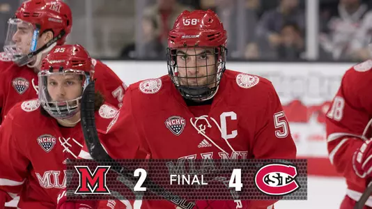 ST. CLOUD, Minn. - All it takes is one minute for things to change as St. Cloud State snapped a 1-1 tie by scoring twice in a 1:11 span early in the third period to hand the Miami hockey team a 4-2 loss on Friday night.