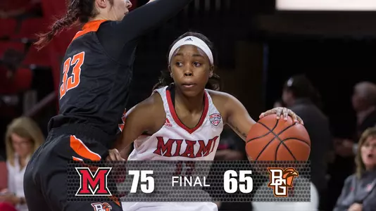 BOWLING GREEN, Ohio -- A consistent offensive attack led by freshman guard Lauren Dickerson and sophomore guard Leah Purvis led the Miami University women's basketball team to a 75-65 victory over Bowling Green in its regular season finale on Saturday. The RedHawks finish the regular season at 11-20 overall and 5-13 in the Mid-American Conference. The Falcons fall to 8-22 overall and 4-14 in the MAC.