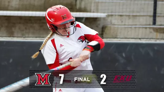 EKU grabbed an early 2-0 lead in the top of the second on the strength of two sacrifice flies. Miami responded by capitalizing on a scoring opportunity in the bottom of the second as sophomore shortstop Michaela Schlattman doubled to right, bringing in two to tie the contest. In the next at-bat, junior center fielder Megan Wurts gave the Red and White the lead at 3-2 with a sacrifice fly that scored freshman left fielder Haeley Tran.