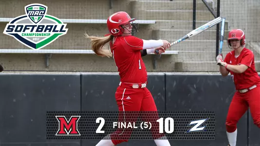 AKRON, Ohio ÃÆ'Æ'¢ÃÆ'¢'¬" In a game that began five hours after its scheduled start time, the Miami University softball team was eliminated from the 2017 Mid-American Conference Softball Championship by the University of Akron, 10-2, in five innings Friday morning at Firestone Stadium.