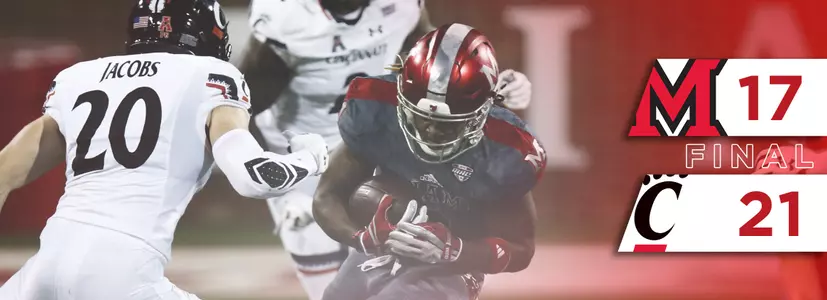 Miami valiantly drove down the field and eventually reached the Cincinnati 25, but got no further as a 3rd-and-5 toss to the end zone did not connect and the Bearcats got pressure on a fourth down conversion attempt to hold off the late RedHawk drive.