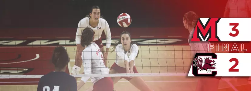 COLUMBIA, S.C. ÃÆ'Æ'¢ÃÆ'¢'¬" For the third time in two seasons, the Miami University volleyball team knocked off a team from the Southeastern Conference as it came from behind to defeat South Carolina (21-25, 25-20, 15-25, 25-22, 15-11) at the Carolina Classic Friday evening. The RedHawks improve to 6-4 on the season, while the Gamecocks fall to 5-3.