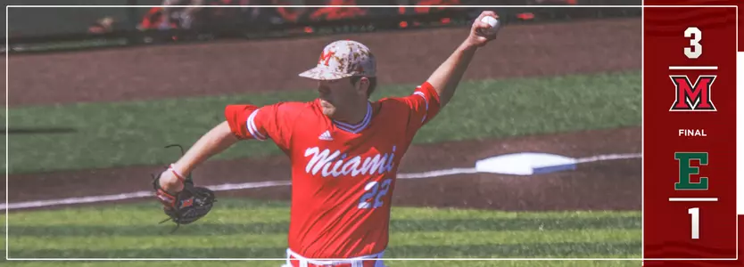 EMU's lone run came in the eighth on a sacrifice fly. Miami starting pitcher Zach Spears went seven innings strong, surrendering zero runs and just five hits while striking out six. Grant Hartwig and Andy Almquist each tossed an inning in relief with the latter recording his fifth save of the season and his second in as many days.
