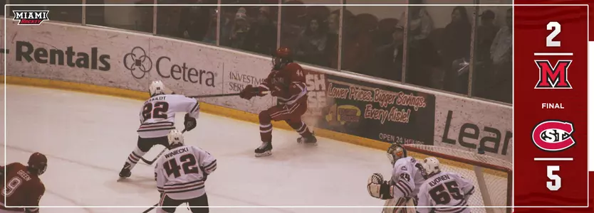 ST. CLOUD, Minn. - The Miami hockey team rallied from an early deficit and was within a goal of top-ranked St. Cloud State in the third period, but fell by a 5-2 score in the first game of the National Collegiate Hockey Conference Playoffs on Friday.