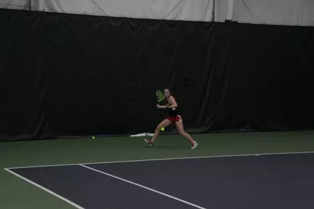 As with each other match this season, the day started with the Red & White claiming the doubles point. Senior duo Nelli Ponomareva and Anastasiia Vasiukhina rolled at first doubles, 6-1, and Emily Struble and Melati Devi brought home a 6-3 on the third court. Freshmen Priyana Kalita and Milana Lysova were leading 4-3 before their match was abandoned.
